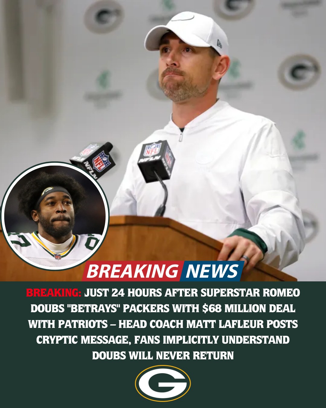 Green Bay, Wisconsin – Just 24 hours after Romeo Doubs stunned Packers Nation by signing a $68 million deal with the New England Patriots, head coach Matt LaFleur posted a cryptic message on his personal social media account, leaving fans speculating about his future with the team. Doubs' sudden departure to the Patriots, after becoming one of the Packers' most reliable receivers, has caused frustration within the organization, and LaFleur's vague post has only added to the fire.